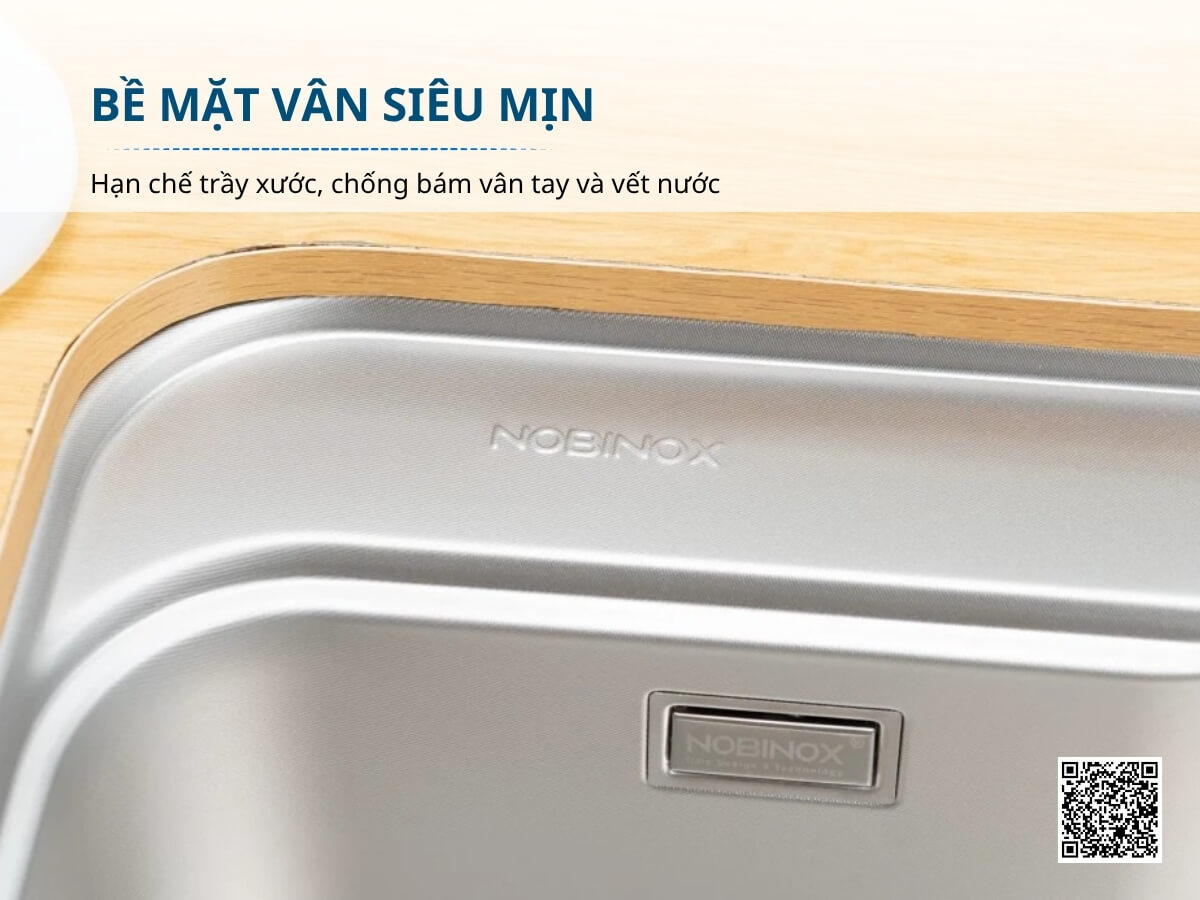 Điểm nhấn tạo nên sự khác biệt của chậu inox Nobinox Rosa NN995D chính là bề mặt vân siêu mịn nhằm tăng khả năng chống trầy xước và chống bám vân tay vượt trội. Công nghệ này giúp hạn chế mài mòn, giữ độ sáng mịn tự nhiên, đồng thời tạo hiệu ứng ánh sáng mềm mại, tinh tế, nâng tầm thẩm mỹ cho không gian bếp.