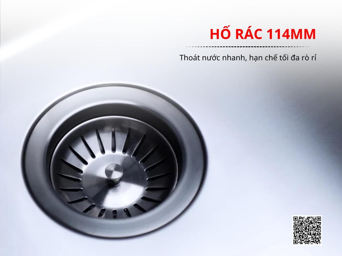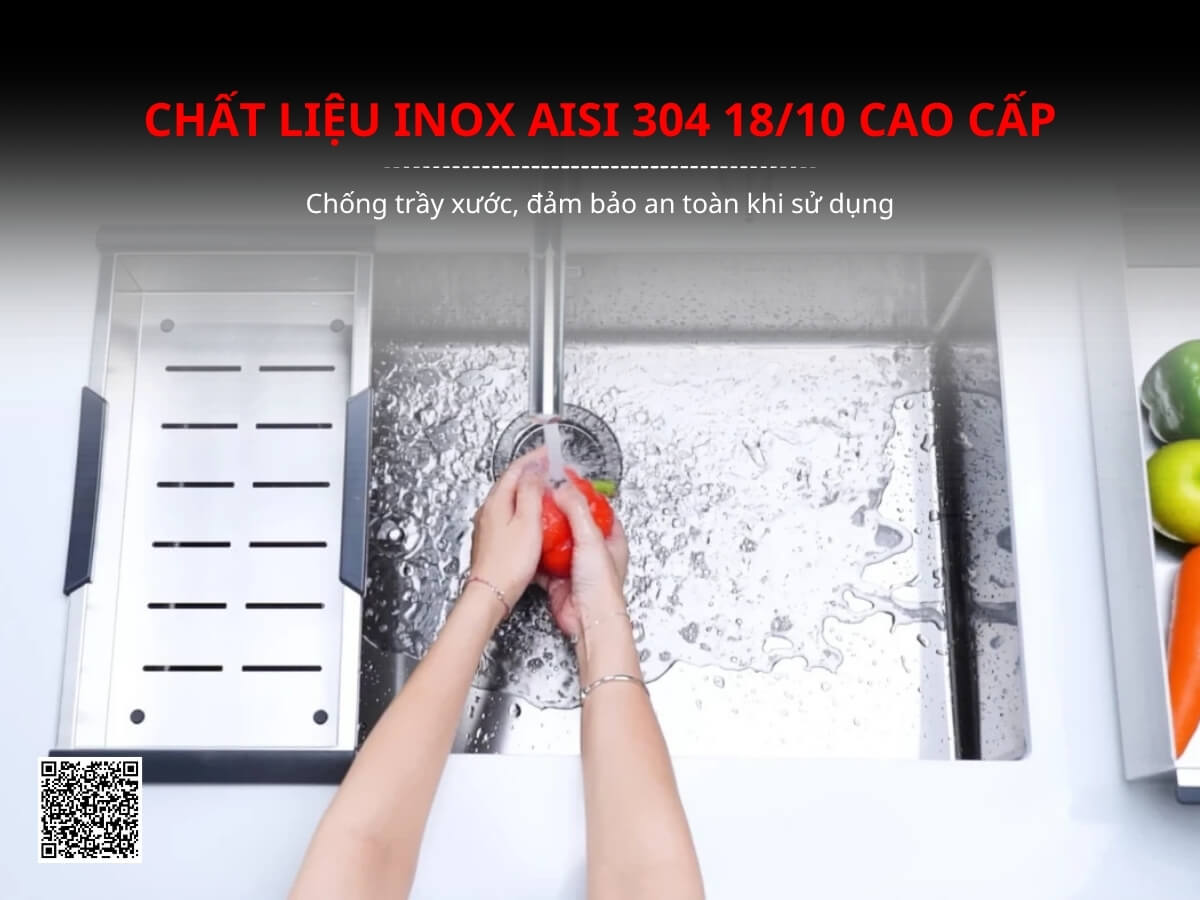 Ngoài ra, chất liệu inox 304 cao cấp còn có khả năng chống ố và chống bám vân tay, giúp chậu luôn giữ được vẻ sáng bóng, sạch sẽ theo thời gian. Nhờ đó, không gian bếp của bạn luôn gọn gàng, sang trọng và đảm bảo vệ sinh tuyệt đối trong quá trình sử dụng hằng ngày.