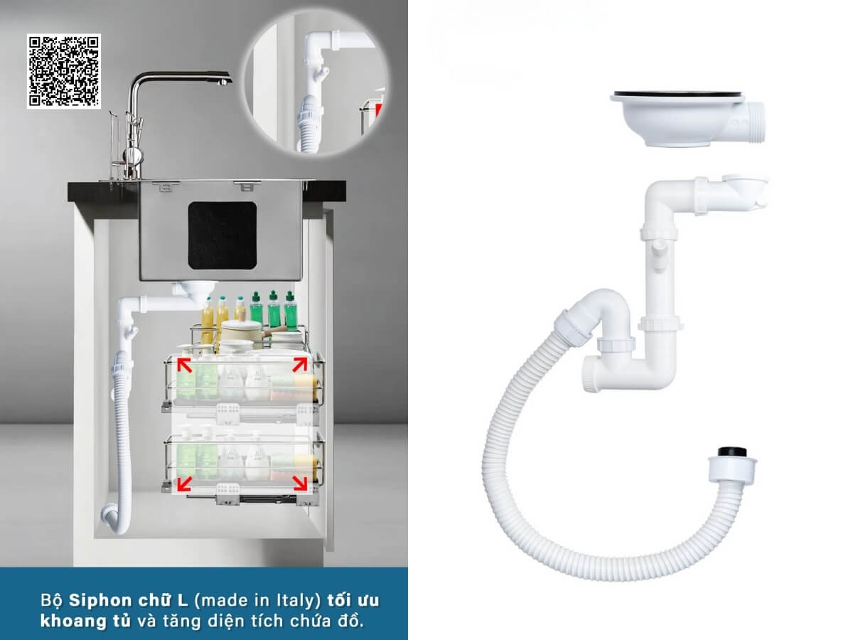 Chậu inox Nobinox Tasca Canova NT600B được trang bị bộ xiphong cao cấp nhập khẩu 100% từ Italy, với khả năng thoát nước nhanh, ngăn mùi hôi và chống rò rỉ nước hiệu quả. Hệ thống hố rác kích thước 114mm liền mạch, không khớp nối giúp hạn chế tối đa rò rỉ, đồng thời phù hợp với thói quen sử dụng của người Việt. Bên cạnh đó, lỗ thoát tràn tích hợp liền mạch với bề mặt chậu giúp vệ sinh dễ dàng hơn, đảm bảo an toàn và sạch sẽ trong quá trình sử dụng. Tất cả chi tiết đều được thiết kế và sản xuất theo công nghệ độc quyền của Italy, mang lại sự an tâm tuyệt đối cho người dùng.