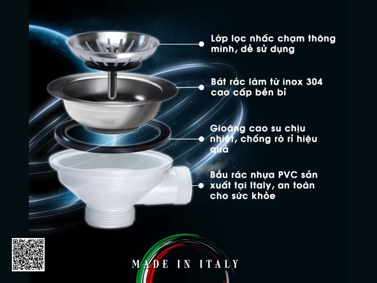 Chậu inox Nobinox Tasca Canova NT600B được trang bị bộ xiphong cao cấp nhập khẩu 100% từ Italy, với khả năng thoát nước nhanh, ngăn mùi hôi và chống rò rỉ nước hiệu quả. Hệ thống hố rác kích thước 114mm liền mạch, không khớp nối giúp hạn chế tối đa rò rỉ, đồng thời phù hợp với thói quen sử dụng của người Việt. Bên cạnh đó, lỗ thoát tràn tích hợp liền mạch với bề mặt chậu giúp vệ sinh dễ dàng hơn, đảm bảo an toàn và sạch sẽ trong quá trình sử dụng. Tất cả chi tiết đều được thiết kế và sản xuất theo công nghệ độc quyền của Italy, mang lại sự an tâm tuyệt đối cho người dùng.