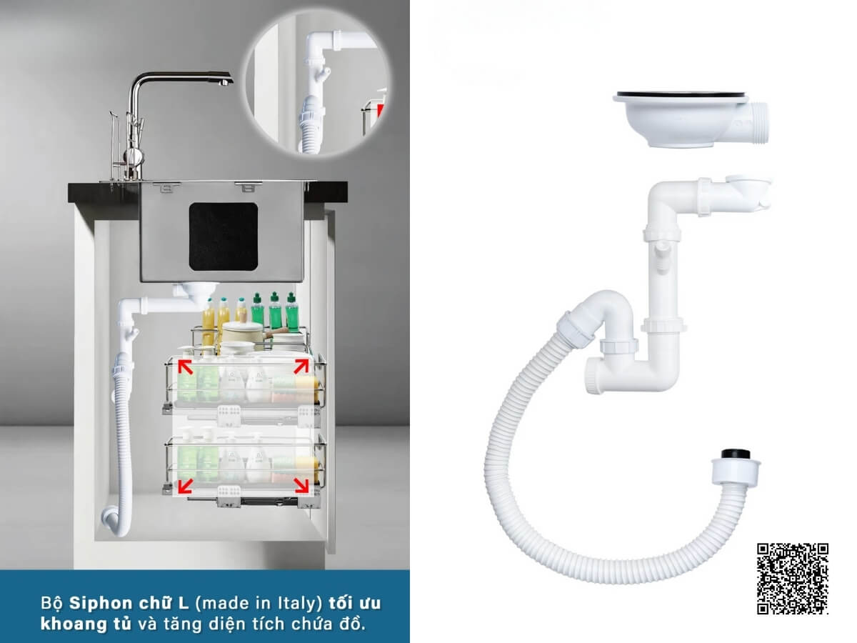 Chậu inox Nobinox Tasca Canova NT699PK được trang bị bộ xiphong cao cấp nhập khẩu 100% từ Italy, với khả năng thoát nước nhanh, ngăn mùi hôi và chống rò rỉ nước hiệu quả. Hệ thống hố rác kích thước 114mm liền mạch, không khớp nối giúp hạn chế tối đa rò rỉ, đồng thời phù hợp với thói quen sử dụng của người Việt. Bên cạnh đó, lỗ thoát tràn tích hợp liền mạch với bề mặt chậu giúp vệ sinh dễ dàng hơn, đảm bảo an toàn và sạch sẽ trong quá trình sử dụng. Tất cả chi tiết đều được thiết kế và sản xuất theo công nghệ độc quyền của Italy, mang lại sự an tâm tuyệt đối cho người dùng.