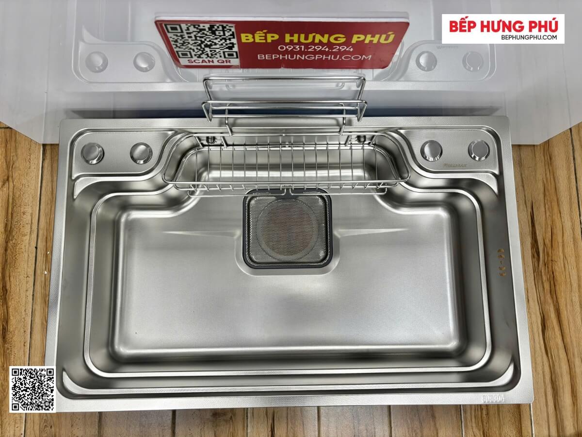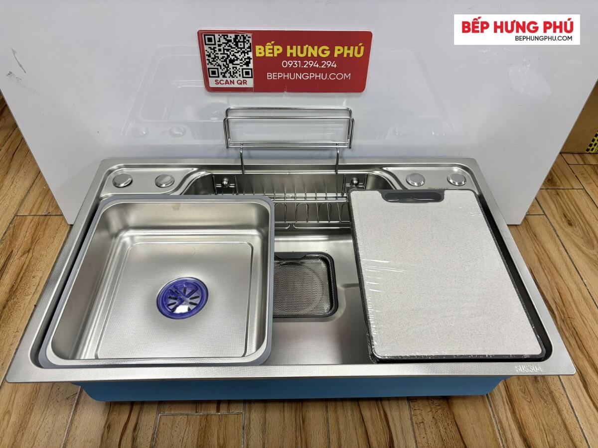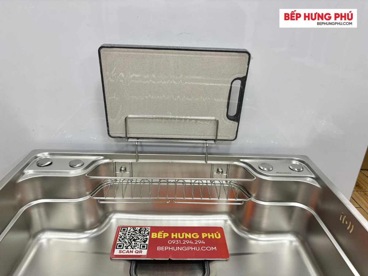 Đặc biệt, chậu được thiết kế gờ hạ bậc hiện đại, có thể tích hợp phụ kiện như chậu rửa nhỏ, thớt, để tăng thêm tiện lợi cho quá trình rửa dọn, có thể cắt thực phẩm và hong ráo ngay trên chậu mà không tốn thêm không gian trên bàn bếp.