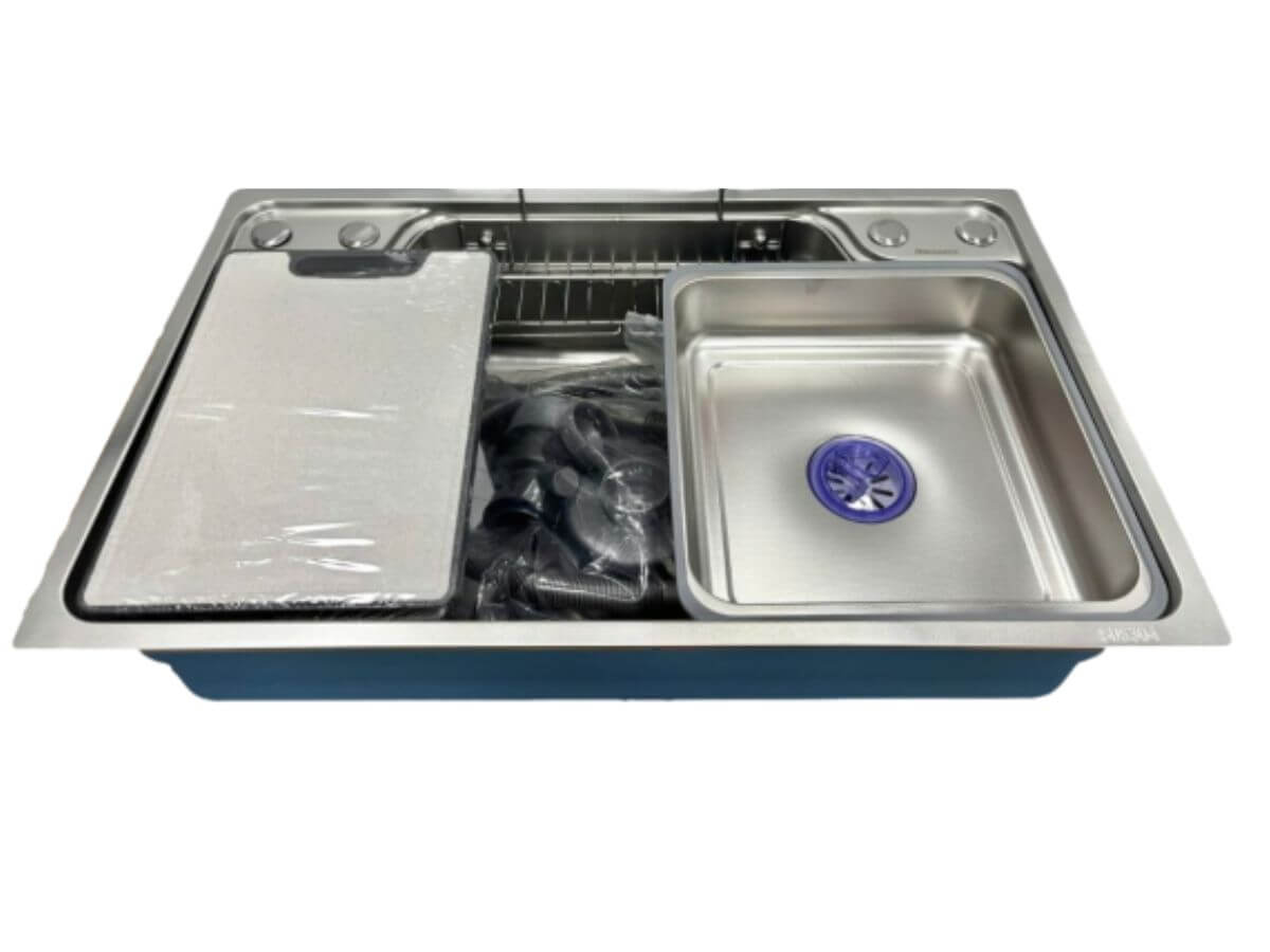Đặc biệt, chậu được thiết kế gờ hạ bậc hiện đại, có thể tích hợp phụ kiện như chậu rửa nhỏ, thớt, để tăng thêm tiện lợi cho quá trình rửa dọn, có thể cắt thực phẩm và hong ráo ngay trên chậu mà không tốn thêm không gian trên bàn bếp.