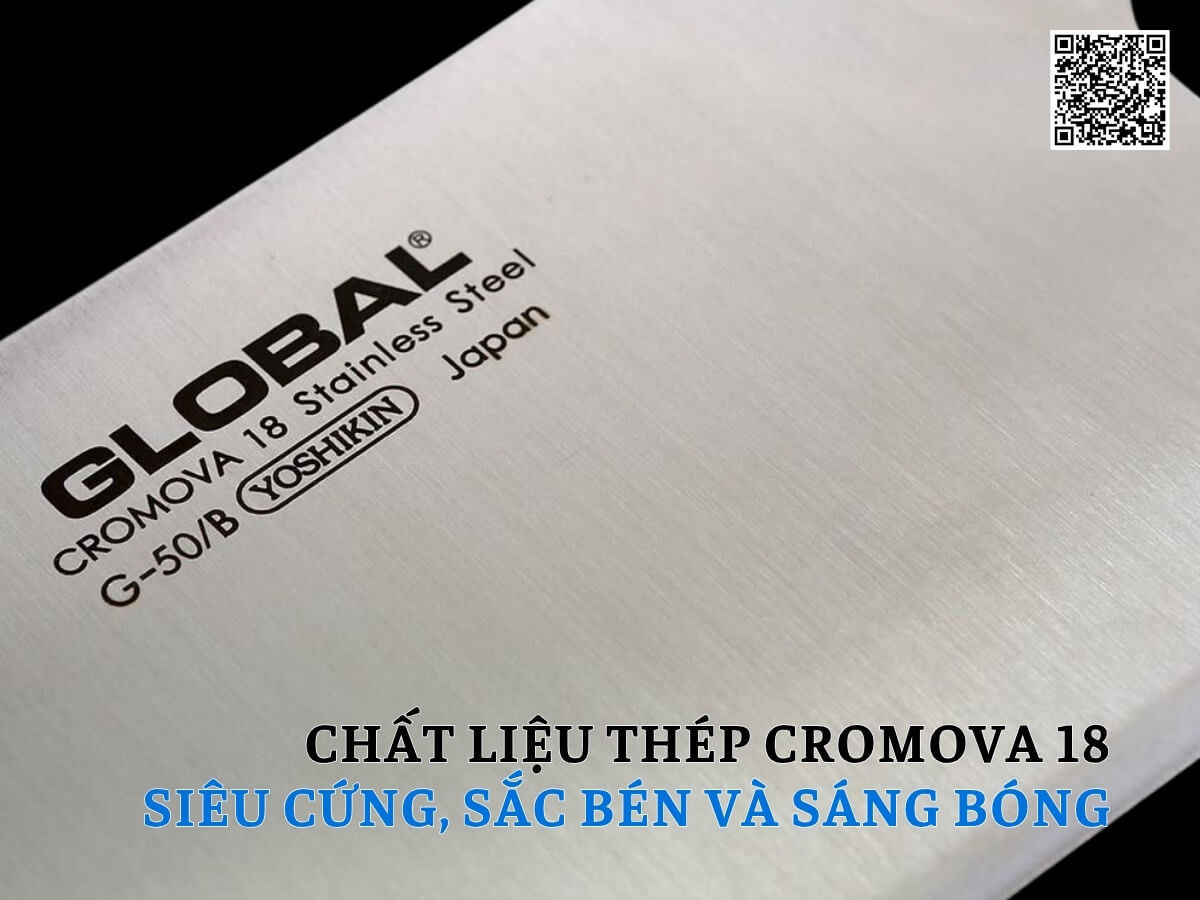 Lưỡi dao chặt Global G-50/B được chế tác từ thép Cromova 18, hợp kim cao cấp của Nhật gồm molybdenum, vanadium và chromium, cho độ cứng đạt 58HRC giúp dao vừa cứng cáp, vừa giữ được độ sắc bén lâu dài. Nhờ cấu trúc kim loại đặc biệt, lưỡi dao chống gỉ sét, chống mòn và sáng bóng theo thời gian, phù hợp cho cả sử dụng tại nhà và trong môi trường bếp chuyên nghiệp.