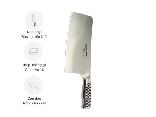 Dao chặt Global G-50/B là dòng dao cao cấp của Nhật Bản, được rèn từ thép không gỉ Cromova 18 nổi tiếng với độ cứng 58HRC, mang đến lưỡi dao sắc bén, sáng bóng và bền bỉ vượt trội. Thiết kế nguyên khối chắc chắn cùng tay cầm thép rỗng chứa cát giúp cân bằng hoàn hảo, cho cảm giác cầm nắm thoải mái và kiểm soát tốt khi chặt.