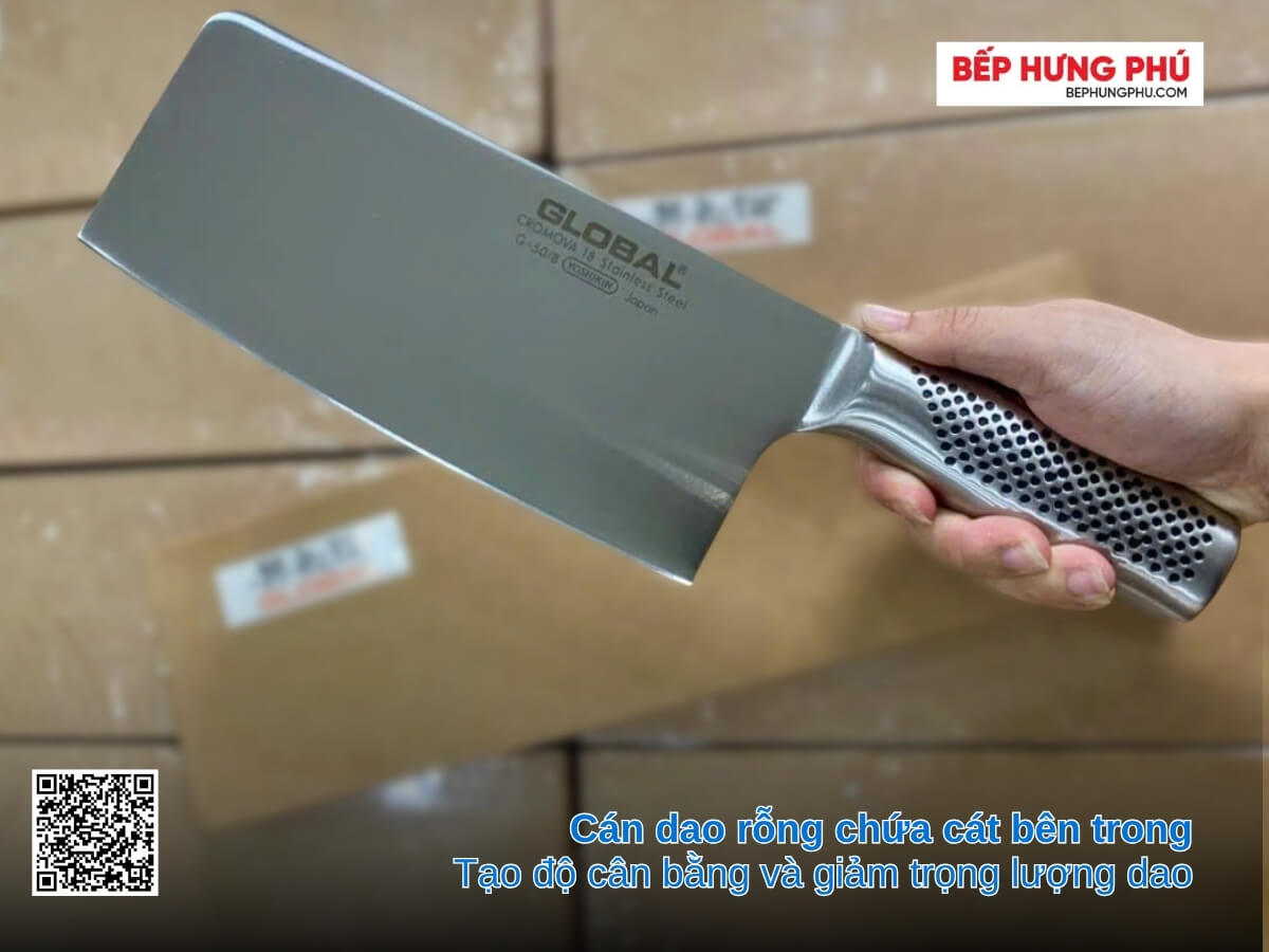 Điểm khác biệt nổi bật của dao chặt Global G-50/B là tay cầm rỗng chứa cát, giúp phân bổ trọng lượng đồng đều giữa cán và lưỡi dao, mang lại sự cân bằng tối ưu khi sử dụng. Thiết kế này giúp giảm tổng trọng lượng dao xuống 30%, chỉ còn 440g, nhờ đó người dùng có thể thao tác lâu mà không bị mỏi tay. Tay cầm bằng thép nguyên khối, cầm chắc tay và dễ kiểm soát khi chặt mạnh.