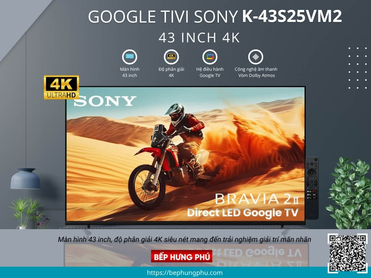 Google Tivi Sony K-43S25VM2 4K 43 inch thiết kế tinh tế, sang trọng sẽ là điểm nhấn cho không gian nội thất của bạn. Màn hình 43 inch cùng độ phân giải 4K siêu nét mang đến trải nghiệm giải trí mãn nhãn. Tivi được trang bị bộ xử lý X1 4K Processor, công nghệ nâng cấp độ phân giải hình ảnh 4K X-Reality PRO, tăng cường màu sắc Live Color, công nghệ âm thanh vòm Dolby Atmos, mang đến chất lượng hình ảnh và âm thanh đỉnh cao. Hệ điều hành Google TV thân thiện với kho ứng dụng đa dạng, đáp ứng đầy đủ nhu cầu giải trí của gia đình.