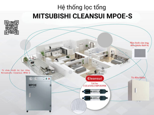Hệ thống lọc tổng Mitsubishi Cleansui MPOE-S sử dụng công nghệ lọc màng sợi rỗng với bộ lọc MPOE050E gồm 2 lõi lọc, giúp lọc sạch cặn bẩn, vi khuẩn, clo dư, kim loại hòa tan trong nước… nhưng vẫn giữ được các khoáng chất tự nhiên có lợi trong nước, tạo nguồn nước sạch, an toàn và tốt cho sức khoẻ.