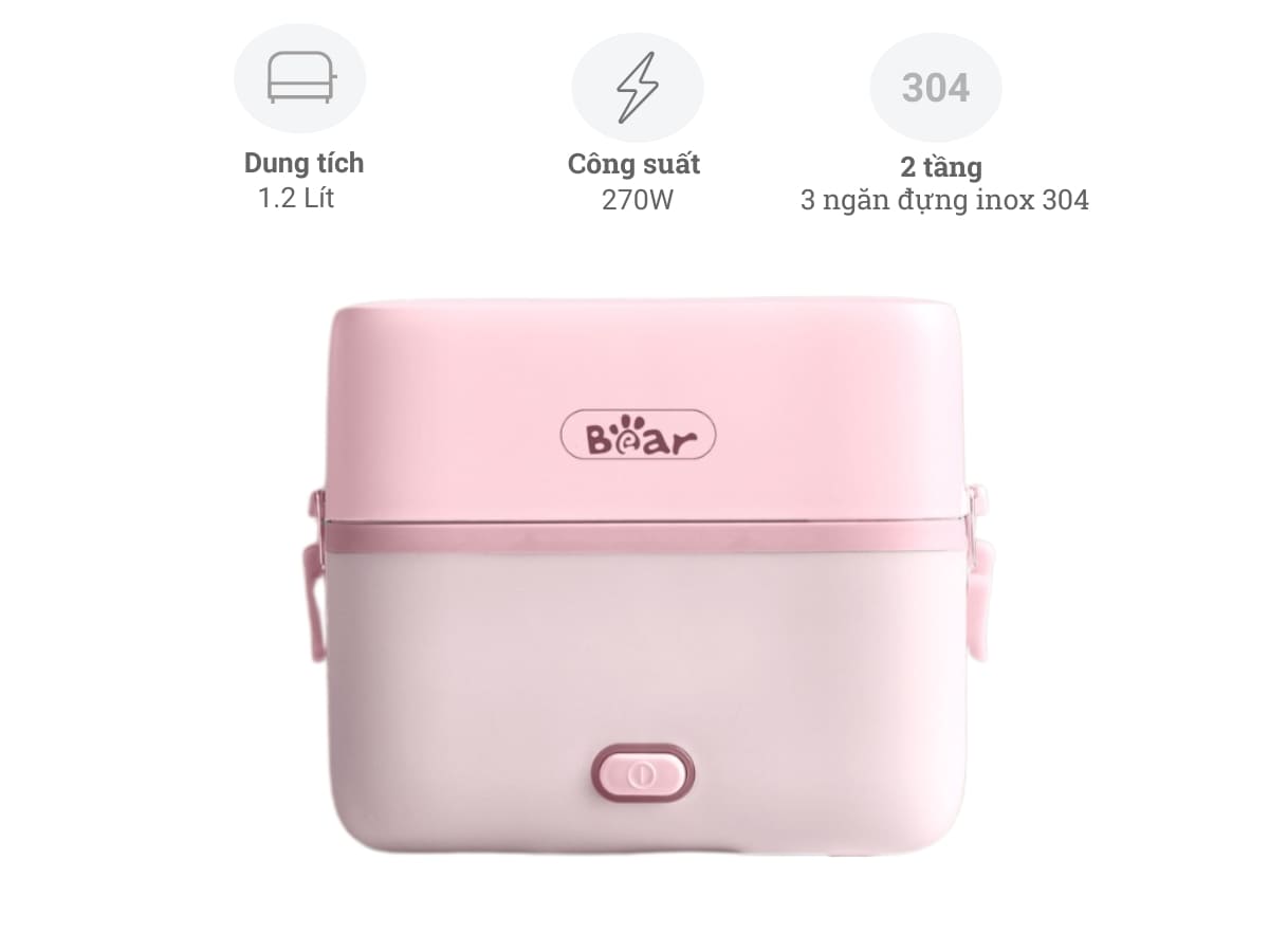 Hộp cơm cắm điện Bear SB-HC12L (Hồng) thiết kế gồm 2 tầng với 2 khay – 3 ngăn đựng thức ăn riêng biệt, tổng dung tích 1.2 lít, là lựa chọn lý tưởng cho người làm văn phòng. Công suất 270W giúp làm nóng thức ăn nhanh chóng, hiệu quả. Khay đựng chất liệu inox 304 chống gỉ, đảm bảo an toàn sức khoẻ, có nắp đậy kín hút chân không, chống rò rỉ, cùng thiết kế hộp có quai xách dễ dàng cầm nắm.