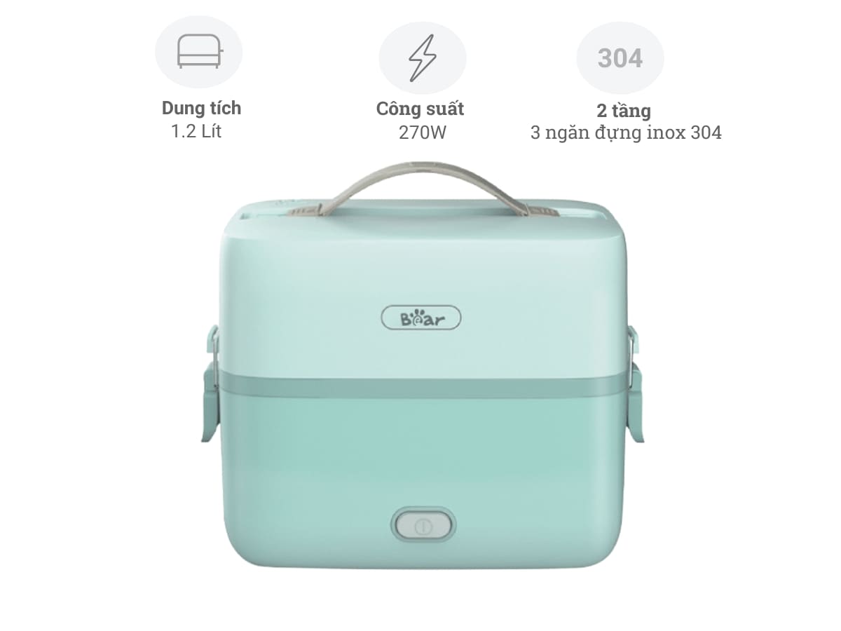 Hộp cơm cắm điện Bear SB-HC12L (Xanh) thiết kế gồm 2 tầng với 2 khay – 3 ngăn đựng thức ăn riêng biệt, tổng dung tích 1.2 lít, là lựa chọn lý tưởng cho người làm văn phòng. Công suất 270W giúp làm nóng thức ăn nhanh chóng, hiệu quả. Khay đựng chất liệu inox 304 chống gỉ, đảm bảo an toàn sức khoẻ, có nắp đậy kín hút chân không, chống rò rỉ, cùng thiết kế hộp có quai xách dễ dàng cầm nắm.
