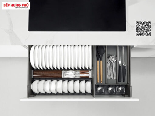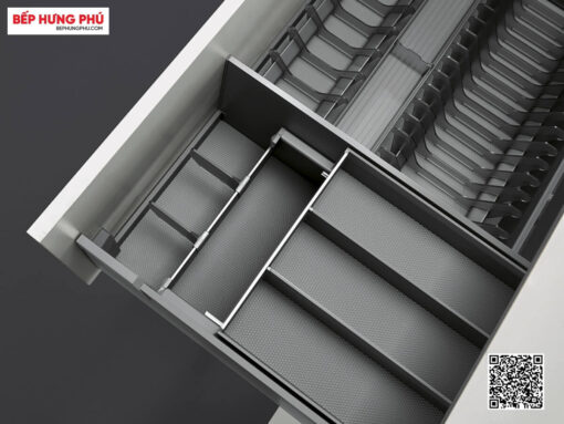 Kệ được lắp âm hoàn toàn vào khoang tủ dưới, giúp tiết kiệm không gian tối đa, tạo sự hiện đại, tiện nghi cho căn bếp. Thiết kế phân chia nhiều khe rãnh với kích thước đa dạng, bạn có thể thoải mái sắp xếp nhiều dụng cụ ăn uống với kích thước lớn nhỏ khác nhau, có ngăn riêng biệt để đựng đũa, muỗng, dao, nĩa… Không chỉ sắp xếp gọn gàng mà còn giữ cho chén bát được sạch sẽ, khô ráo, hạn chế bụi bẩn, đảm bảo vệ sinh.