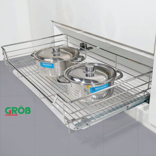 [caption id="attachment_107177" align="alignnone" width="1200"] Ray trượt giảm chấn êm ái, mượt mà[/caption]Kệ xoong nồi Grob C1GX90C thiết kế hệ thống ray trượt giảm chấn giúp kéo ra - đẩy vào nhẹ nhàng, êm ái, không gây tiếng ồn khó chịu trong bếp, mang lại trải nghiệm sử dụng mượt mà. Ngoài ra còn đảm bảo an toàn cho đồ dùng, tránh bị đổ ngã khi đóng mở cửa tủ.