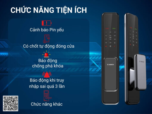 – Chức năng khác: chức năng ngăn trẻ nhỏ tự ý mở cửa từ phía trong; chức năng xáo trộn mã, mã số ảo tối đa 32 kí tự; báo động chốt chính; báo động ổ khoá