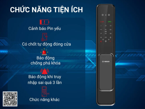 – Chức năng khác: chức năng ngăn trẻ nhỏ tự ý mở cửa từ phía trong; chức năng xáo trộn mã, mã số ảo tối đa 32 kí tự; báo động chốt chính; báo động ổ khoá