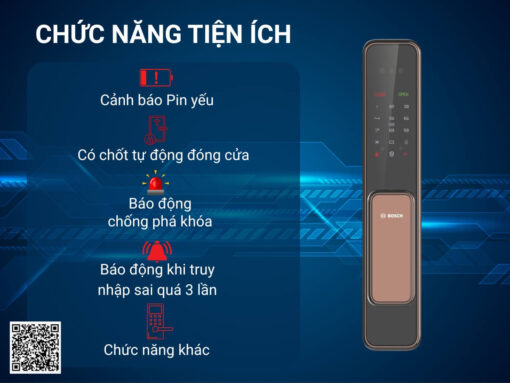 – Chức năng khác: chức năng ngăn trẻ nhỏ tự ý mở cửa từ phía trong; chức năng xáo trộn mã, mã số ảo tối đa 32 kí tự; báo động chốt chính; báo động ổ khoá