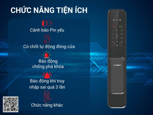 – Chức năng khác: chức năng ngăn trẻ nhỏ tự ý mở cửa từ phía trong; chức năng xáo trộn mã, mã số ảo tối đa 32 kí tự; báo động chốt chính; báo động ổ khoá