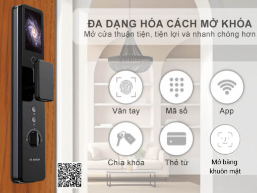 Khóa điện tử Bosch FU6+ cung cấp đến 6 phương thức mở cửa tiện lợi và an toàn, gồm: khuôn mặt, vân tay, mật khẩu, thẻ từ, chìa cơ và App. Cùng với khả năng lưu trữ người dùng lớn, bao gồm: