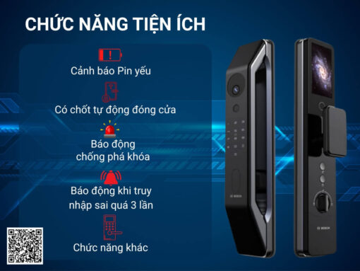 – Chức năng khác: chế độ yên lặng ban đêm, kết hợp cảm biến phát hiện bất thường, chức năng ngăn trẻ nhỏ tự ý mở cửa từ phía trong; chức năng xáo trộn mã, mã số ảo tối đa 32 kí tự; báo động chốt chính; báo động ổ khoá