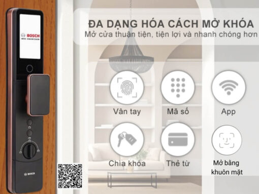Khóa điện tử Bosch FU6+ cung cấp đến 6 phương thức mở cửa tiện lợi và an toàn, gồm: khuôn mặt, vân tay, mật khẩu, thẻ từ, chìa cơ và App. Cùng với khả năng lưu trữ người dùng lớn, bao gồm: