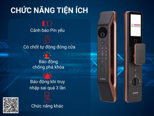 – Chức năng khác: chế độ yên lặng ban đêm, kết hợp cảm biến phát hiện bất thường, chức năng ngăn trẻ nhỏ tự ý mở cửa từ phía trong; chức năng xáo trộn mã, mã số ảo tối đa 32 kí tự; báo động chốt chính; báo động ổ khoá