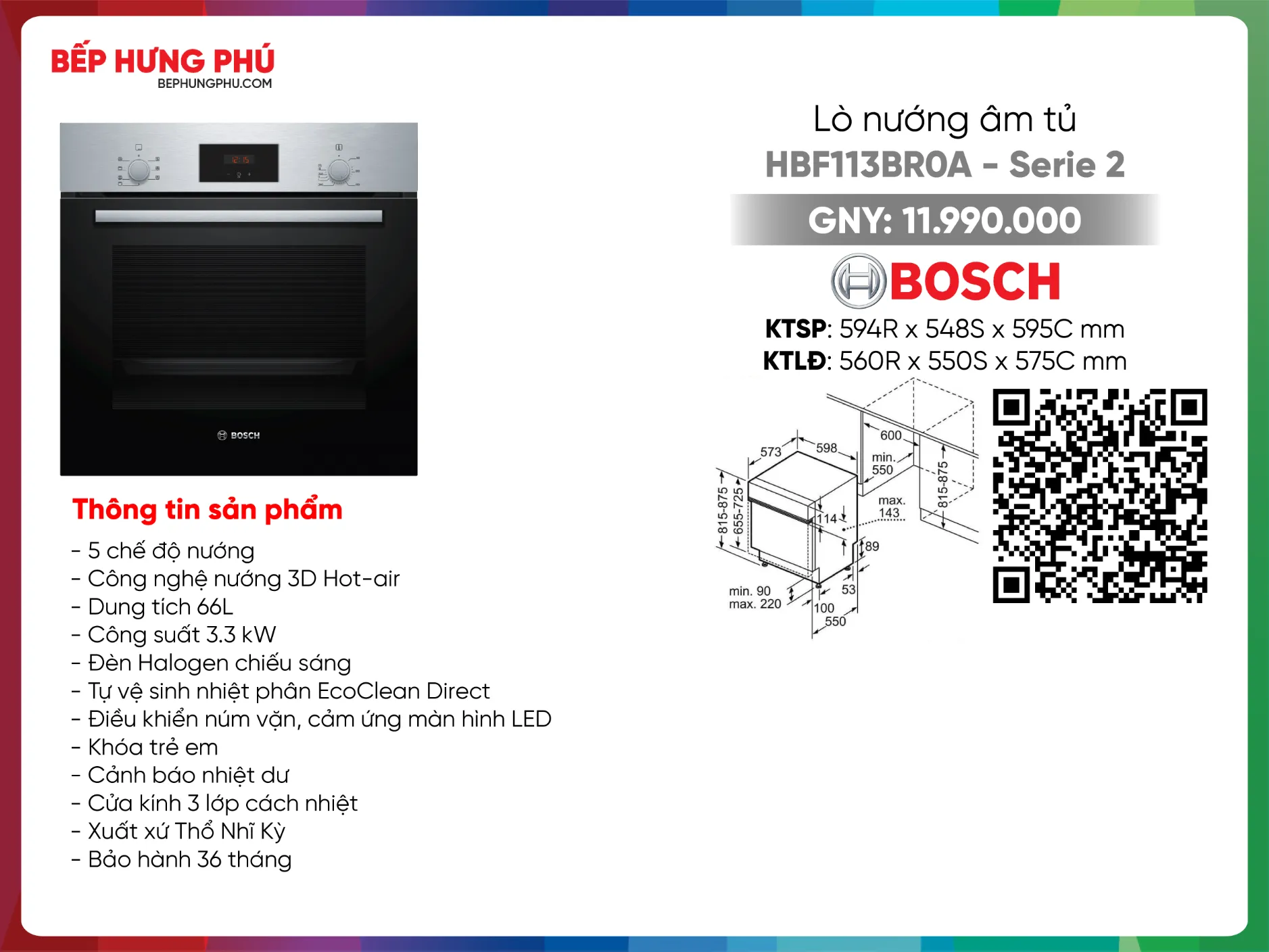 Hiện tại, sản phẩm lò nướng Bosch HBF113BR0A đang được bán tại website cũng như Showroom của Bếp Hưng Phú với giá cực kỳ ưu đãi với những chính sách bảo hành từ lỗi của nhà sản xuất. Quý khách hãy gọi trực tiếp vào đường dây nóng để nhận được những tư vấn chi tiết hoặc đặt hàng trên website, Bếp Hưng Phú sẽ gọi xác nhận đơn hàng với quý khách.