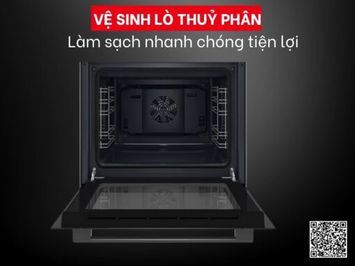 Lò nướng Bosch HBF512BB1T được trang bị chức năng hỗ trợ làm sạch bằng phương pháp thủy phân, giúp giảm bớt công sức vệ sinh lò. Bạn chỉ cần cho khoảng 400ml nước và một giọt nước rửa chén vào đáy lò, sau đó chọn chương trình làm sạch. Hơi nước được tạo ra ở nhiệt độ cao sẽ làm mềm các vết bẩn và dầu mỡ cứng đầu. Sau khi chu trình kết thúc, bạn chỉ cần dùng khăn ẩm lau sạch bên trong là khoang lò lại sáng bóng như mới.