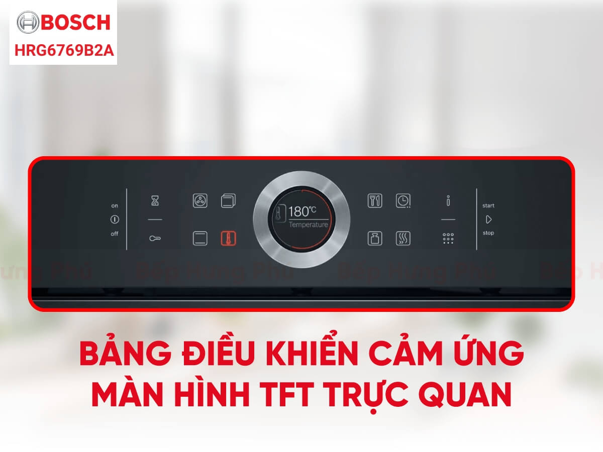 Lò nướng Bosch HRG6769B2A được trang bị điều khiển cảm ứng nhạy, mượt và màn hình TFT hiển thị rõ ràng, sắc nét. Giúp người dùng có thể dễ dàng quan sát và điều chỉnh các chức năng và thiết lập thời gian nấu ăn một cách chính xác và nhanh chóng.