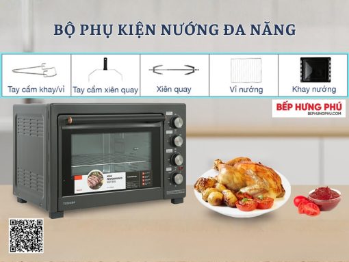 Bộ sản phẩm đi kèm gồm khay nướng, vỉ nướng, xiên quay, tay cầm lấy khay/vỉ và tay cầm lấy xiên quay, giúp người dùng linh hoạt trong từng công thức nấu nướng. Tất cả phụ kiện đều dễ tháo lắp, thuận tiện cho việc vệ sinh và bảo quản sau mỗi lần sử dụng.