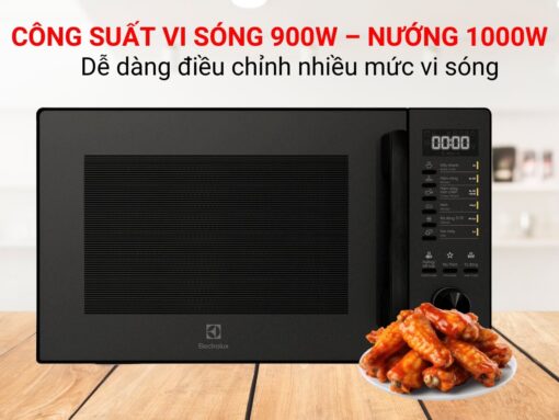 Lò vi sóng Electrolux EMG25D22BM được thiết kế để bàn nhỏ gọn, màu đen dễ kết hợp với mọi không gian bếp. Dung tích 25 lít phù hợp với nhiều gia đình, phục vụ tốt cho các nhu cầu hâm nóng, rã đông, nấu thực phẩm. Đặc biệt còn có chức năng nướng với công suất 1000W có thể nướng thịt, gà, pizza… Có 9 chế độ nấu nướng phù hợp với nhiều loại thực phẩm và nhu cầu khác nhau.