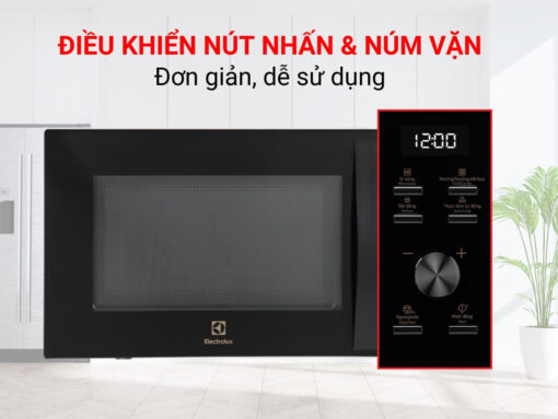 Lò vi sóng Electrolux EMG25D59EB được trang bị giao diện điều khiển đơn giản gồm các nút nhấn để chọn chế độ nấu và 1 núm vặn để điều chỉnh thời gian nấu, cùng với màn hình hiển thị thời gian còn lại của chương trình, giúp bạn dễ dàng quan sát và điều khiển lò. Đặc biệt, giao diện điều khiển tiếng Việt – Anh rõ ràng, dễ sử dụng và phù hợp với mọi người dùng.