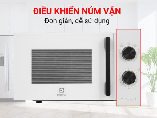 Lò vi sóng Electrolux EMM20K22W được trang bị giao diện điều khiển đơn giản với 2 núm vặn để chọn chế độ nấu nướng và điều chỉnh thời gian/ khối lượng thực phẩm. Đặc biệt, giao diện điều khiển tiếng Việt – Anh rõ ràng, dễ sử dụng và phù hợp với mọi người dùng.