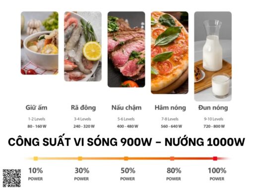 Công suất vi sóng 900W – nướng 1000W, 5 mức điều chỉnh công suất vi sóng, 10 chương trình nấu tự động