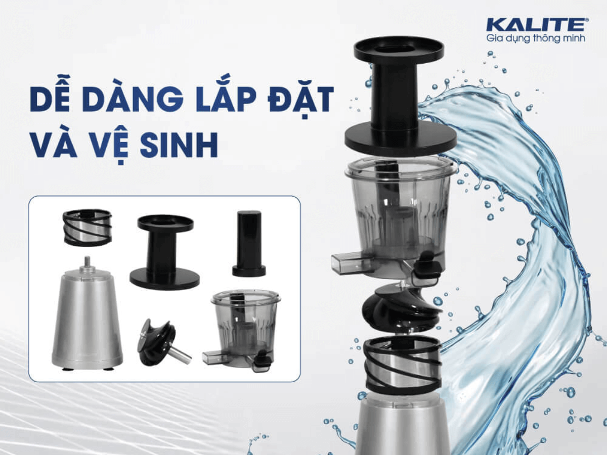 Máy ép chậm Kalite KSJ4411 thiết kế đơn giản với chỉ vỏn vẹn 6 bộ phận cùng phụ kiện 2 cốc đựng nước/bã , tạo ra sự thuận tiện tối đa trong quá trình sử dụng và bảo quản. Nhờ vào cấu trúc này, việc tháo lắp và vệ sinh máy trở nên dễ dàng hơn, giảm bớt phiền phức và tiết kiệm thời gian cho người sử dụng.