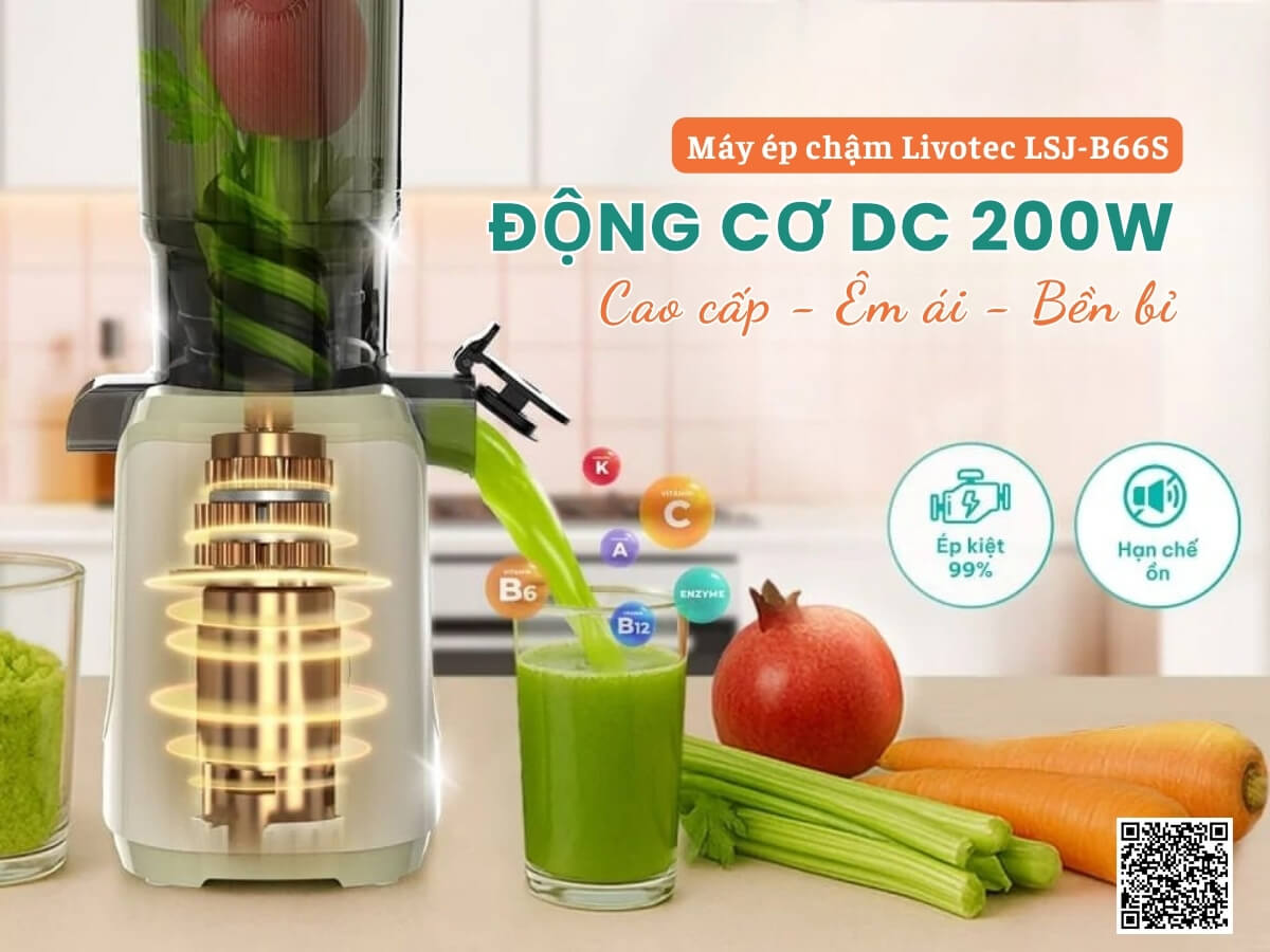 Không giống máy ép thông thường gây ồn và nhanh hỏng, máy ép chậm Livotec LSJ-B66S sử dụng động cơ DC lõi đồng cao cấp với công suất 200W và tốc độ quay 45-60 vòng/phút. Thiết kế này mang lại nhiều ưu điểm vượt trội: