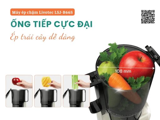Máy ép chậm Livotec LSJ-B66S với ống tiếp cực đại 108mm, người dùng có thể ép nguyên trái táo, lê, cà rốt lớn mà không cần cắt nhỏ, đồng thời vẫn giữ nguyên cấu trúc và hương vị của trái cây. Thiết kế ống tiếp kép thông minh còn cho phép bạn thêm nguyên liệu ngay khi máy đang hoạt động, mang lại sự tiện lợi tối đa so với các máy ép thông thường. Nhờ đó, việc chuẩn bị nước ép trở nên nhanh chóng, dễ dàng và tiết kiệm công sức hơn nhiều.