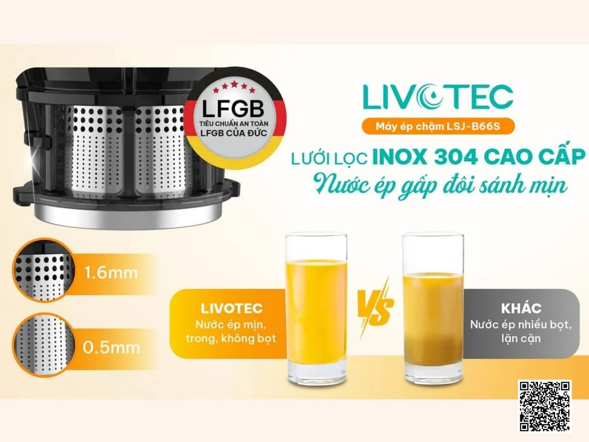 Máy ép chậm Livotec LSJ-B66S được trang bị bộ lọc siêu vi inox 304 với kết cấu 2 tầng, đạt chuẩn LFGB Đức – tiêu chuẩn an toàn thực phẩm khắt khe hàng đầu châu Âu. Bộ lọc có kích thước siêu nhỏ từ 0.5 – 1.6mm, giúp: