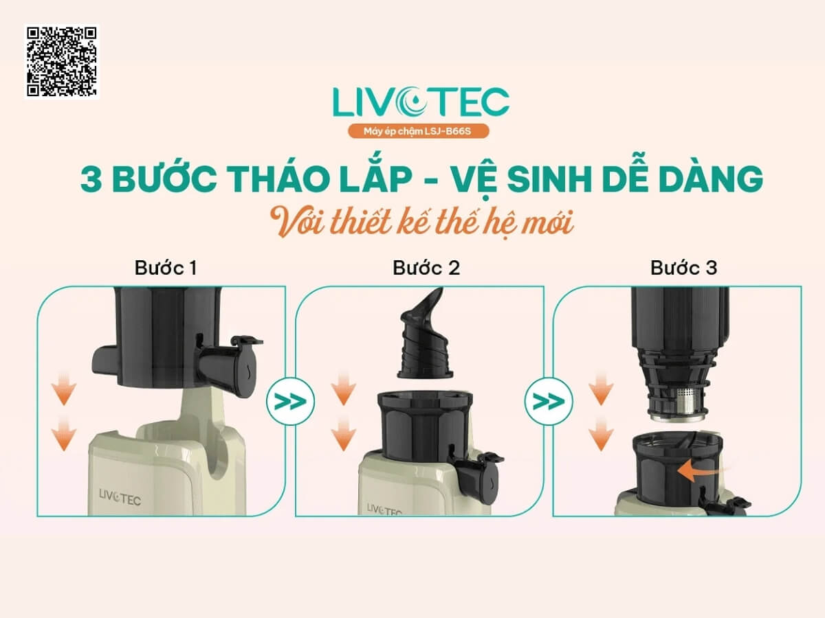 Máy ép chậm Livotec LSJ-B66S được thiết kế để tháo lắp nhanh chóng chỉ trong 3 bước, giúp việc vệ sinh trở nên đơn giản và nhanh gọn. Không còn tình trạng nhiều chi tiết phức tạp như các máy ép truyền thống, LSJ-B66S giúp bạn tiết kiệm thời gian mỗi sáng mà vẫn đảm bảo vệ sinh sạch sẽ các bộ phận tiếp xúc với thực phẩm. Đây là ưu điểm quan trọng cho những gia đình bận rộn nhưng vẫn muốn thưởng thức nước ép tươi ngon mỗi ngày.