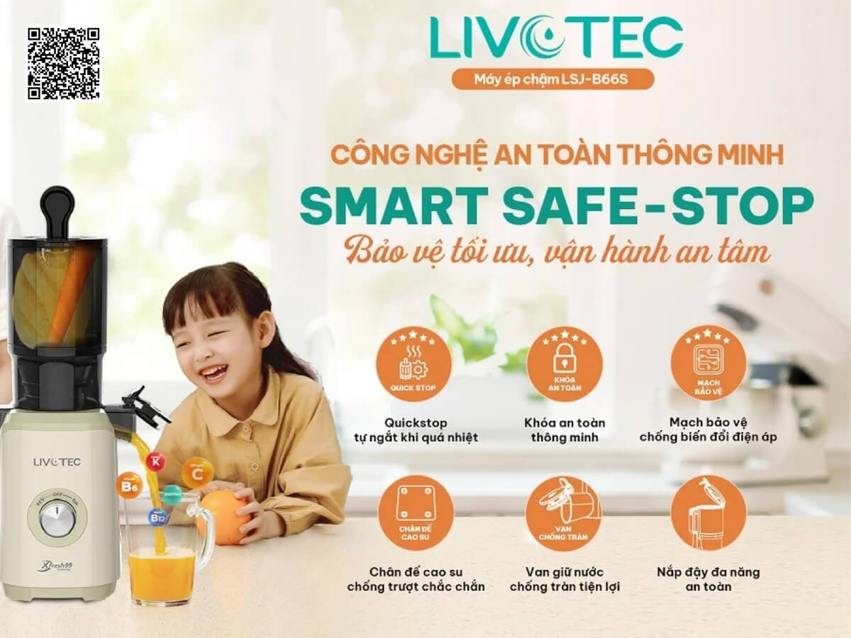 Máy ép chậm Livotec LSJ-B66S trang bị các tính năng an toàn thông minh, bao gồm tự ngắt khi quá tải hoặc nắp chưa đóng kín, chống tràn, chống sét, khóa an toàn, van chống trào và chân đế cao su chống trượt. Nhờ đó, bạn hoàn toàn yên tâm khi sử dụng máy cho gia đình, kể cả khi có trẻ nhỏ xung quanh, đảm bảo việc vận hành luôn an toàn và ổn định.