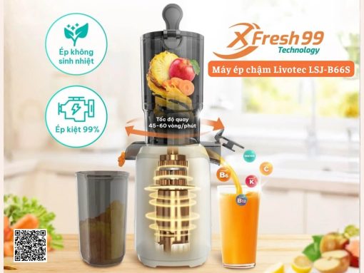 Máy ép chậm Livotec LSJ-B66S không chỉ tiện dụng mà còn mang tính thẩm mỹ cao, giúp tô điểm cho không gian bếp thêm trang nhã và hiện đại. Sản phẩm nổi bật với công nghệ ép lạnh XFresh99, giúp nước ép giữ trọn 99% vitamin và enzyme, đem lại lợi ích làm đẹp da, tăng đề kháng, bảo vệ tim mạch và chống oxy hóa. Khác với máy ép thông thường, LSJ-B66S ép chậm ở tốc độ 45-60 vòng/phút, không sinh nhiệt, đảm bảo chất lượng nước ép tươi mịn tuyệt đối.