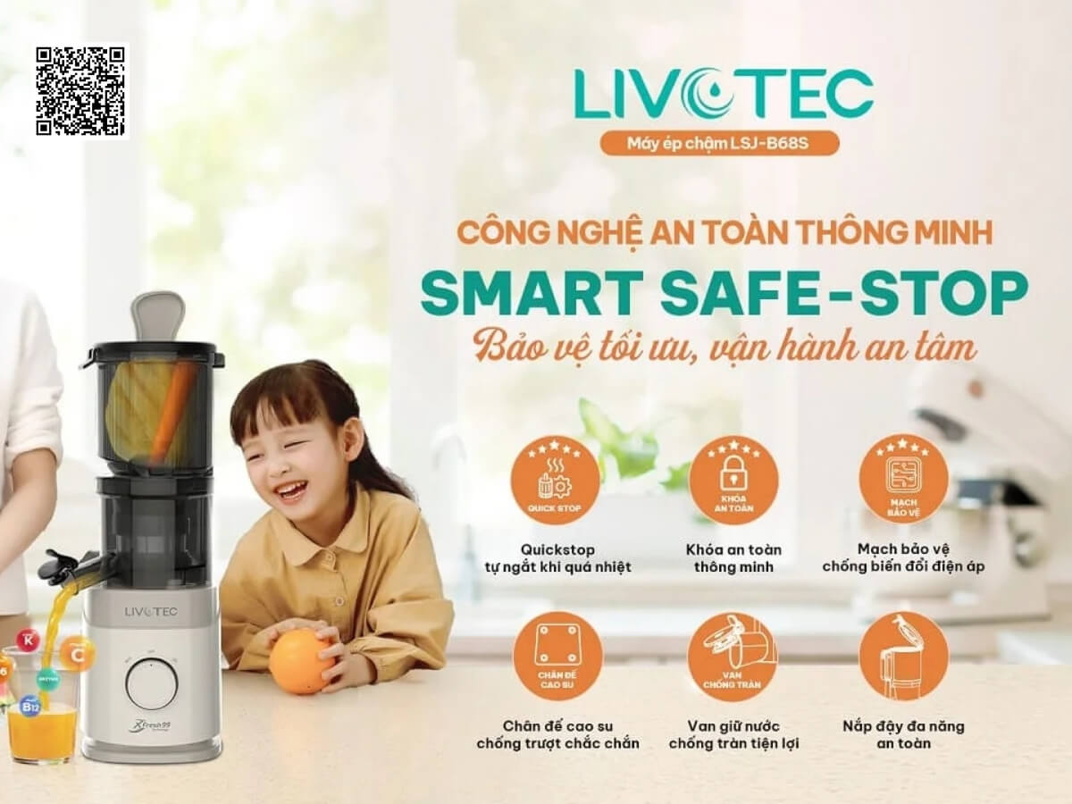 Máy ép chậm Livotec LSJ-B68S trang bị Smart Safe Stop, tự động ngắt khi quá nhiệt, mở nắp hoặc lắp sai. Máy còn có khóa an toàn, đế cao su chống trượt, van chống trào và mạch bảo vệ, đảm bảo an toàn tối đa, đặc biệt phù hợp với gia đình có trẻ nhỏ. Người dùng hoàn toàn yên tâm sử dụng máy hàng ngày mà không lo rủi ro.