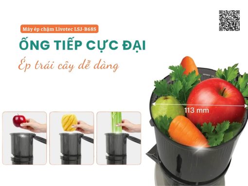 Máy ép chậm Livotec LSJ-B68S với thiết kế nhỏ gọn, màu be thanh lịch và ống tiếp nguyên liệu 113mm giúp ép nguyên trái nhanh chóng. Công nghệ ép lạnh XFresh99 giữ trọn 99% dưỡng chất, kết hợp trục ép răng cưa hiệu suất cao và động cơ DC êm ái mang đến nước ép sánh mịn, tươi ngon và an toàn cho cả gia đình.