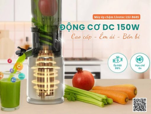 Máy ép chậm Livotec LSJ-B68S trang bị động cơ DC lõi đồng 100% công suất 150W, vận hành êm ái, duy trì tốc độ quay ổn định, giúp ép kiệt bã và tiết kiệm điện năng. Động cơ bền bỉ hạn chế hao mòn, giảm tiếng ồn, mang lại trải nghiệm sử dụng lâu dài và thoải mái. Với động cơ DC, máy có thể ép liên tục nhiều loại nguyên liệu mà không lo nóng máy hay làm mất vitamin, enzyme quý giá.