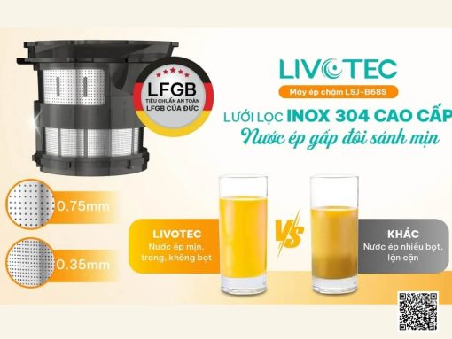 Máy ép chậm Livotec LSJ-B68S được trang bị bộ lọc Inox304 siêu nhỏ 0.35mm, đạt tiêu chuẩn LFGB Đức, đảm bảo an toàn tuyệt đối cho sức khỏe. Kết cấu 2 tầng của bộ lọc loại bỏ hoàn toàn xơ và cặn, giúp nước ép sánh mịn, trong suốt, không lợn cợn hay ám mùi kim loại. Bộ lọc không gỉ, không thôi nhiễm kim loại nặng và không phản ứng với axit từ trái cây, mang đến nước ép nguyên chất, tinh khiết và đảm bảo an toàn tuyệt đối cho cả gia đình.
