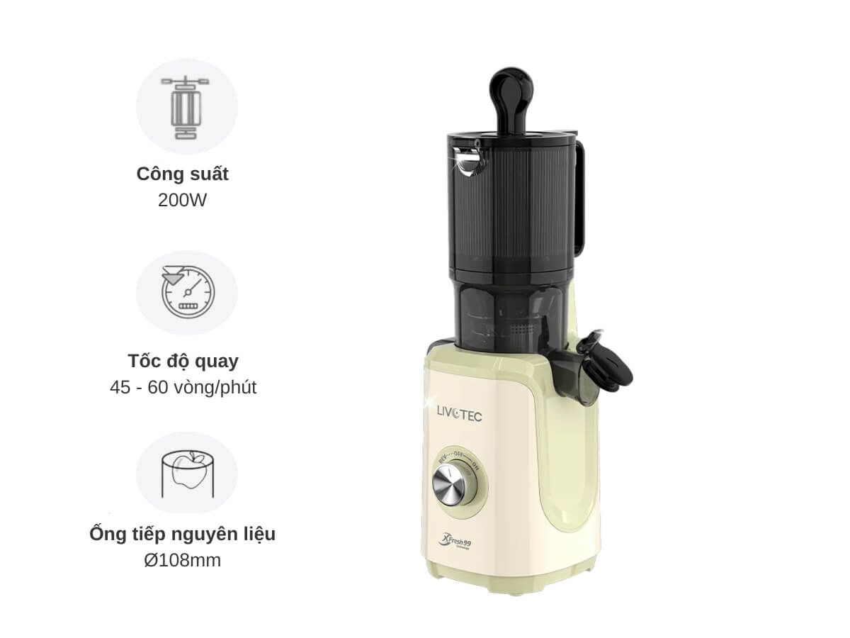 Máy ép chậm Livotec LSJ-M66S nổi bật với thiết kế nhỏ gọn, màu xanh thanh lịch cùng ống tiếp nguyên trái 108mm, giúp ép trái cây nhanh chóng mà không cần cắt nhỏ. Nhờ công nghệ ép lạnh XFresh99, máy giữ trọn tới 99% dưỡng chất, mang đến nước ép sánh mịn, tươi ngon nguyên chất ngay tại nhà, vừa tiện lợi vừa tốt cho sức khỏe.