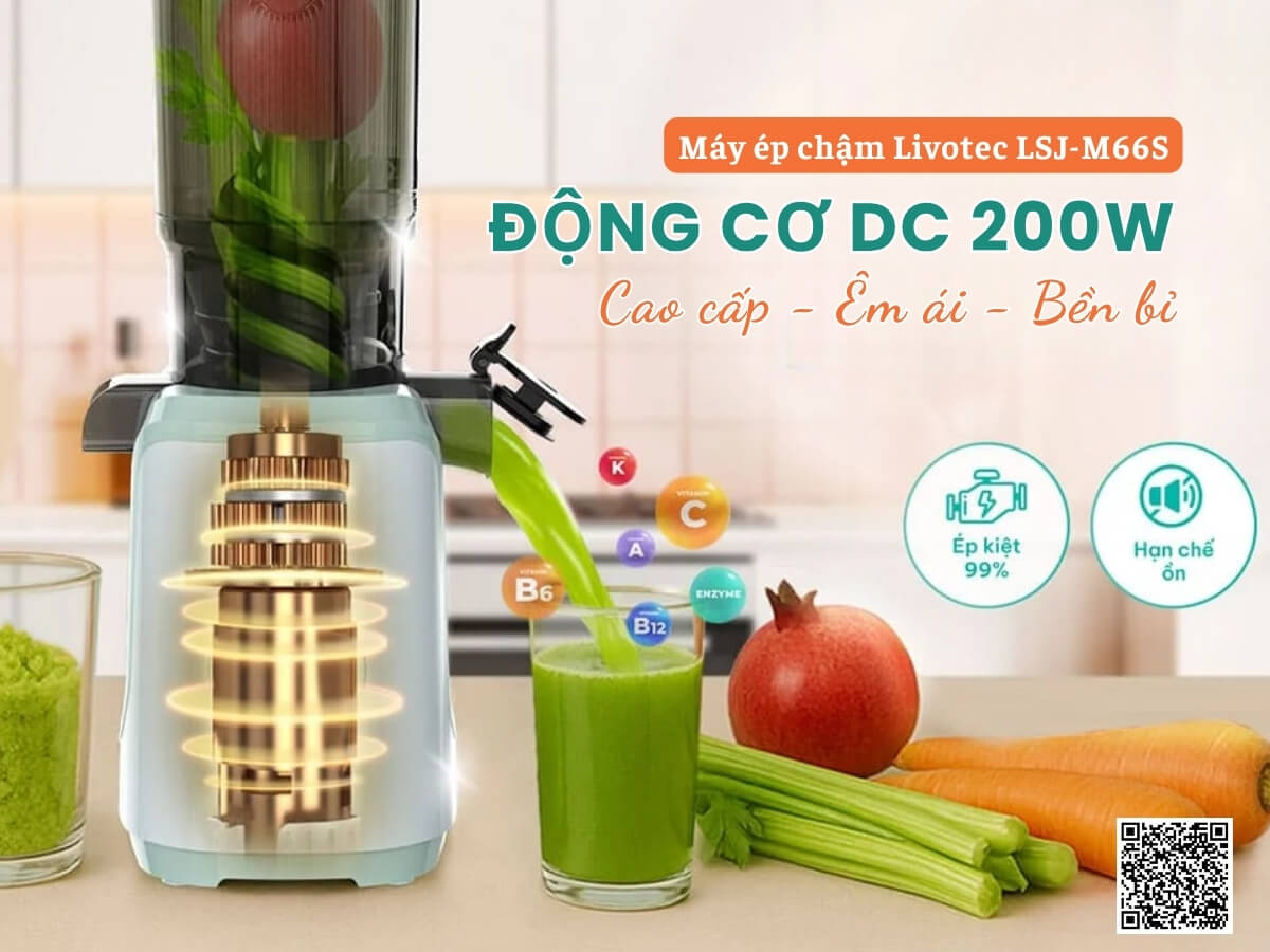 Không giống máy ép thông thường gây ồn và nhanh hỏng, máy ép chậm Livotec LSJ-M66S sử dụng động cơ DC lõi đồng cao cấp với công suất 200W và tốc độ quay 45-60 vòng/phút. Thiết kế này mang lại nhiều ưu điểm vượt trội: