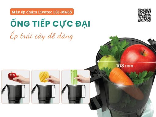 Máy ép chậm Livotec LSJ-M66S với ống tiếp cực đại 108mm, người dùng có thể ép nguyên trái táo, lê, cà rốt lớn mà không cần cắt nhỏ, đồng thời vẫn giữ nguyên cấu trúc và hương vị của trái cây. Thiết kế ống tiếp kép thông minh còn cho phép bạn thêm nguyên liệu ngay khi máy đang hoạt động, mang lại sự tiện lợi tối đa so với các máy ép thông thường. Nhờ đó, việc chuẩn bị nước ép trở nên nhanh chóng, dễ dàng và tiết kiệm công sức hơn nhiều.