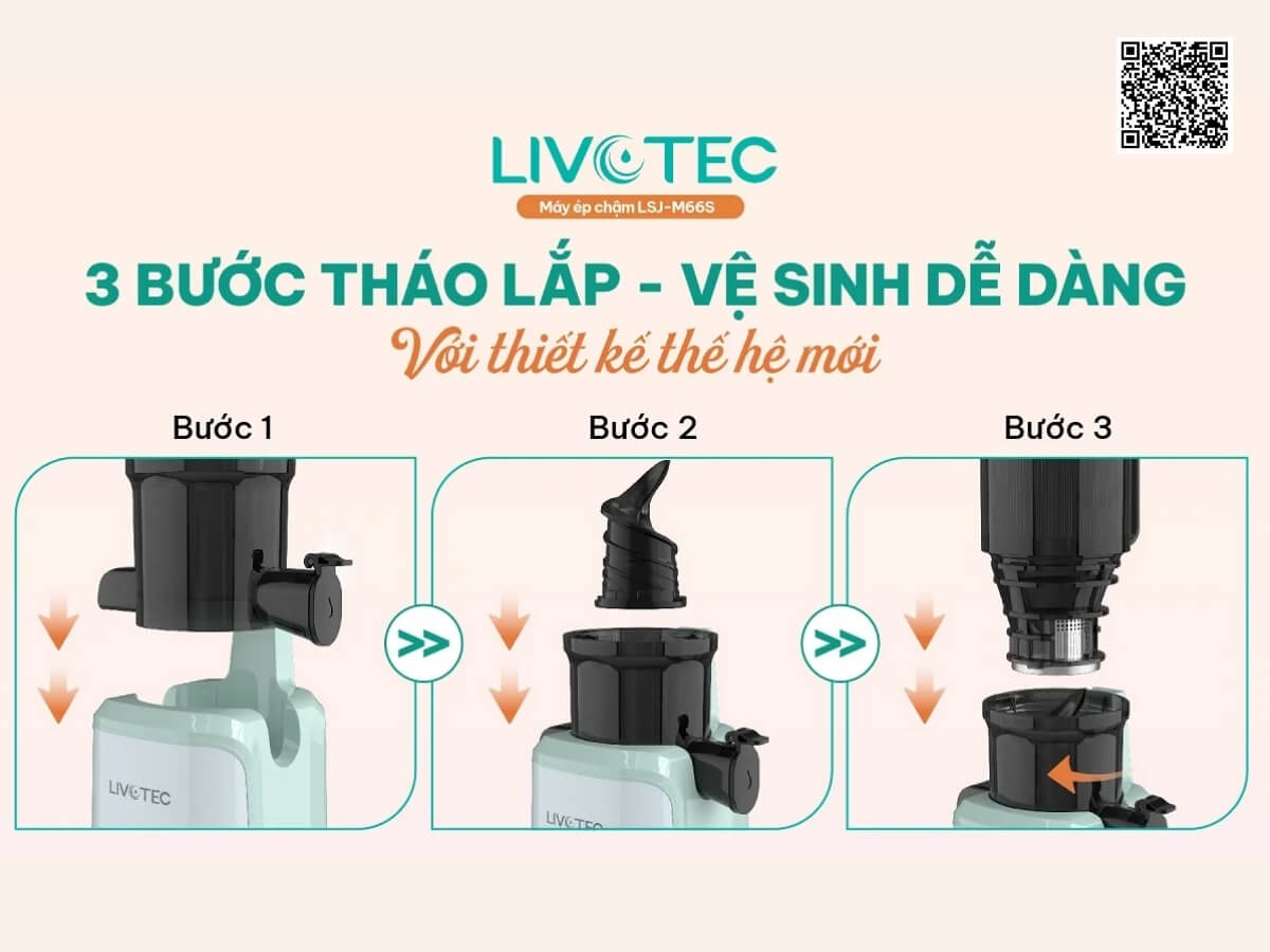 Máy ép chậm Livotec LSJ-M66S được thiết kế để tháo lắp nhanh chóng chỉ trong 3 bước, giúp việc vệ sinh trở nên đơn giản và nhanh gọn. Không còn tình trạng nhiều chi tiết phức tạp như các máy ép truyền thống, LSJ-B66S giúp bạn tiết kiệm thời gian mỗi sáng mà vẫn đảm bảo vệ sinh sạch sẽ các bộ phận tiếp xúc với thực phẩm. Đây là ưu điểm quan trọng cho những gia đình bận rộn nhưng vẫn muốn thưởng thức nước ép tươi ngon mỗi ngày.