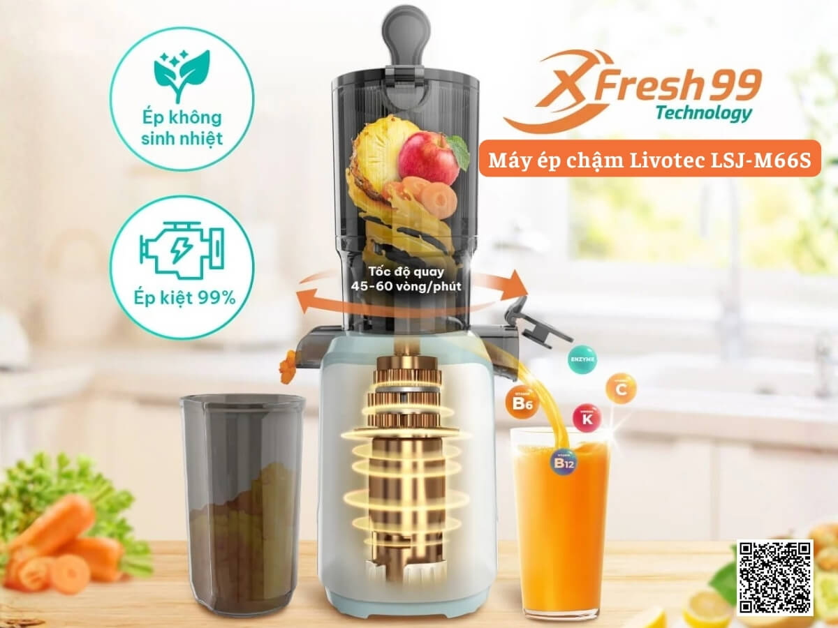 Nhờ công nghệ ép lạnh XFresh99, máy ép chậm Livotec LSJ-M66S mang đến trải nghiệm uống nước ép khác biệt. Máy ép chậm ở tốc độ thấp, không sinh nhiệt, giúp bảo toàn tối đa vitamin A, C, enzyme và polyphenol, nhờ đó nước ép không những ngon, sánh mịn mà còn giữ trọn các lợi ích sức khỏe cho người sử dụng. Đây chính là điểm nổi bật giúp LSJ-B66S khác biệt hoàn toàn so với máy ép thông thường, vốn có nguy cơ làm mất đi dưỡng chất do sinh nhiệt cao khi ép.
