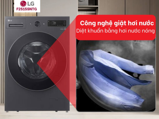 Máy giặt LG F2515SNTG tích hợp thêm công nghệ giặt hơi nước Steam tiên tiến. Cụ thể, trong quá trình giặt, máy sẽ phun hơi nước nóng ngay trong lồng để khử trùng và loại bỏ nhiều loại vi khuẩn gây hại tốt hơn so với chỉ sử dụng nước thông thường. Công nghệ này giúp mang lại quần áo sạch hơn, thơm hơn, đồng thời làm mềm vải và giảm nhăn hiệu quả.