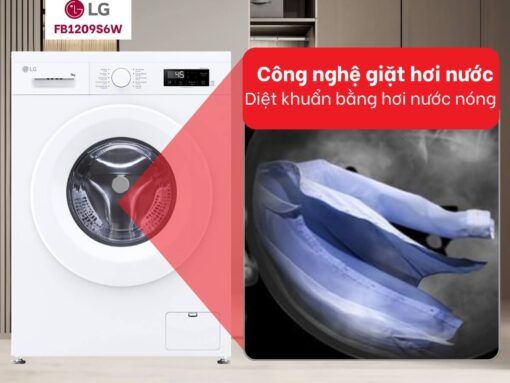 Máy giặt LG FB1209S6W được tích hợp công nghệ giặt hơi nước Steam giúp loại trừ đến 99,9% vi khuẩn, làm mềm và sạch quần áo một cách hiệu quả. Công nghệ này sử dụng hơi nước ở nhiệt độ cao phun trực tiếp lên quần vải, giúp diệt khuẩn và giảm nhăn trên quần áo, mang đến trải nghiệm giặt giũ tuyệt vời hơn cho mọi gia đình, đặc biệt hữu ích khi giặt quần áo cho trẻ em hay người dễ bị dị ứng.